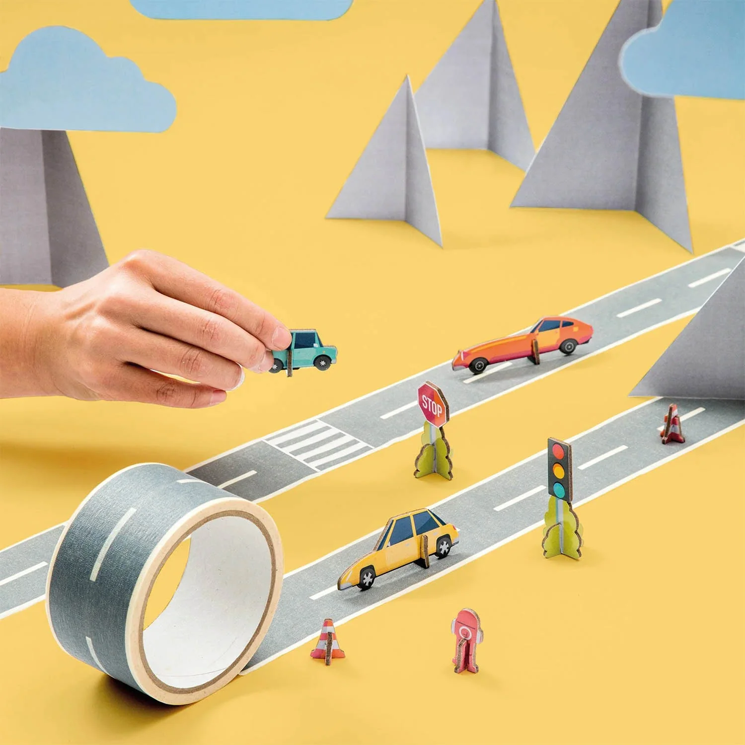 Ce ruban créatif transforme le sol, les meubles ou les murs en une vraie autoroute miniature — parfaite pour les jeux d’enfants, les idées déco originales ou même pour imaginer votre propre ville à la maison. Il est accompagné de petits élements pour jouer (voiture, feux, panneaux ..)