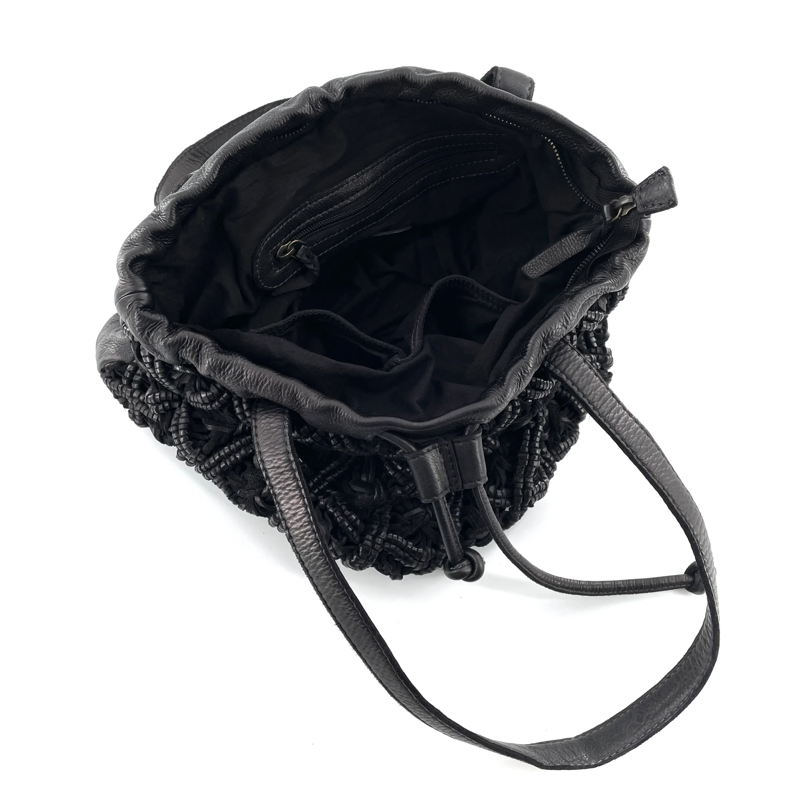 Ce sac porté épaule en cuir tressé s’ouvre à l’aide d’une fermeture éclair.